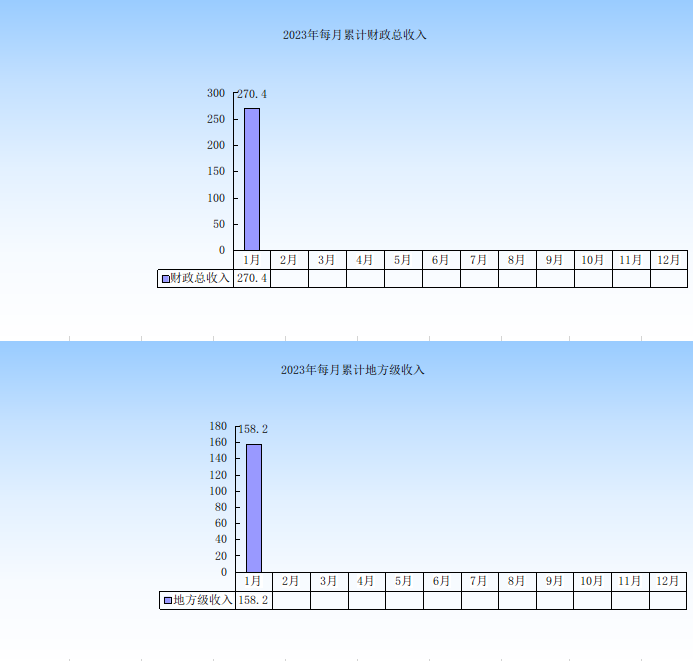 2023年1月,全市一般公共预算财政总收入270.4亿元,增长2.2%,为预算17.2%;地方级收入158.2亿元,增长7.0%,为预算17.0%。一般公共预算支出115.7亿元,增长3.3%,完成预算的11.0%。